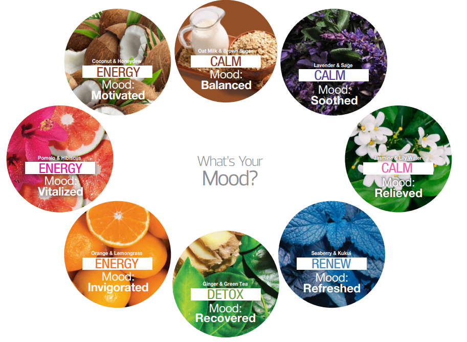 Wähle aus vier Stimmungskategorien und acht Düften, die perfekt zu deinem aktuellen Gemütszustand passen.